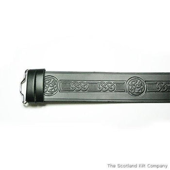 The kilt belt is paired with a kilt buckle in a shiny or antique finish. Traditional kilt belts or montrose kilt belts are made from hide leather and about 2.25 inches wide. Belts for kilts do not go through the belt loops but sit on top of the loops, around the top of the kilt. We have a large variety of kilt belts for sale with designs featuring thistles, serpents, celtic designs and claddagh symbols.