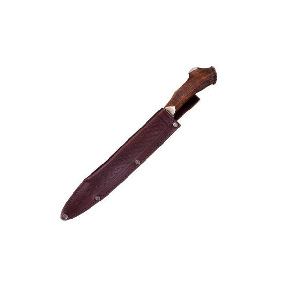 This dirk has a traditional serrated blade made from Carbon steel and a horn handle, it comes with a leather sheath that has a Celtic pattern embossed in to it.