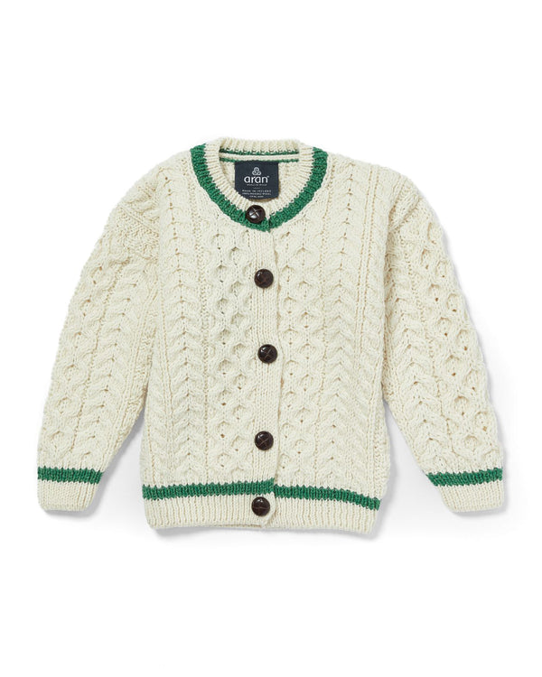 Beautiful children's cardigan made from 100% merino wool with traditional cable aran pattern in cream with a green stripe detail.