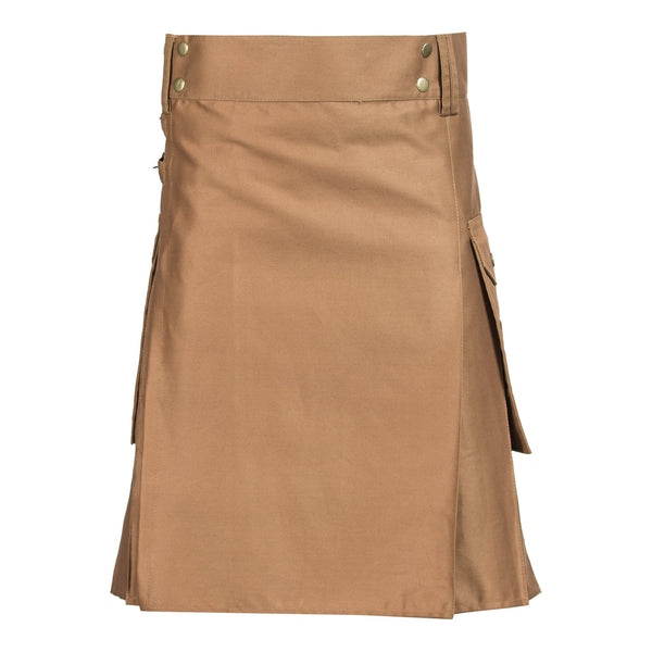 This stylish men's dark khaki utility kilt has a pocket on each side and is pleated on the back like a normal kilt. The front fastens with two poppers, and 2 side straps as shown. The kilt also has a standard 24" drop.