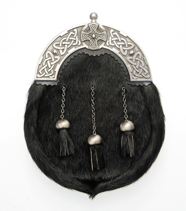 This stunning full dress sporran has an antique finish cantle sporting the classic Celtic cross in the centre and interlaced patterns to each side, atop a body of black calfskin with three antique-capped tassels hung from straight chains.