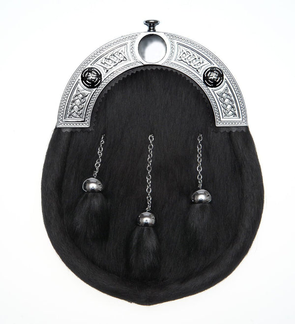 This elegant full dress sporran is made from black calfskin with triple chrome-capped matching tassels on straight chains. The chrome cantle has a mirrored central boss with a circular Celtic knot on either side, surrounded by panels of interlacing.