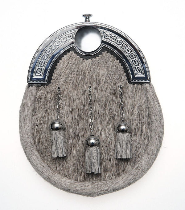 This stunning calfskin sporran has elegant cantle with a large central boss and panels of interlacing on either side, the sporran also has triple chrome-capped tassels. An excellent choice to complete your outfit.