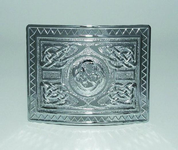 100% steel belt buckle in a chrome finish featuring a celtic highland swirl design.