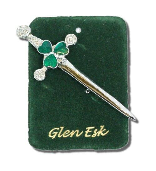 This kilt pin features the classic Irish shamrock with inlaid green leaves over the hilt, in a shiny chrome finish. Comes on a display pad.