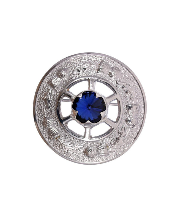 100% steel brooch featuring thistle design with blue stone in the centre.