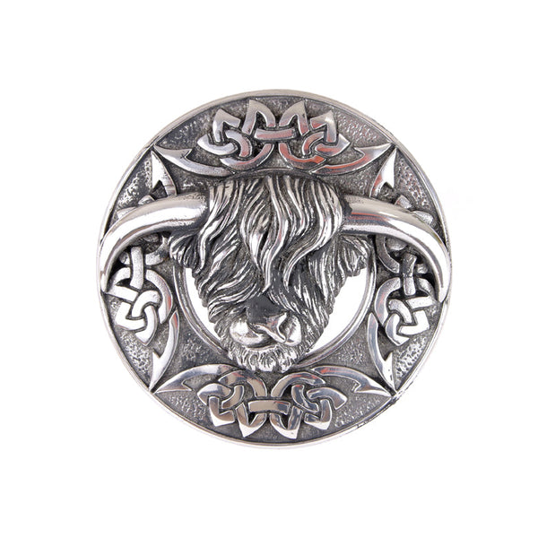 Plaid brooch made from pewter featuring a central highland cow emblem with a celtic design surround in a polished finish.