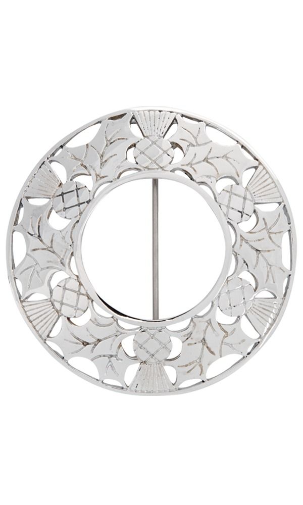 Plaid brooch made from pewter featuring a thistle design with an open centre in a polished finish.