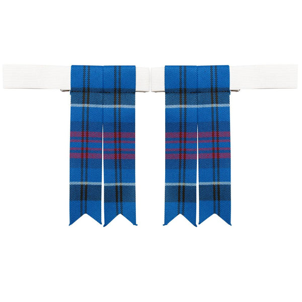 These tartan kilt hose flashes come with elasticated garters with velcro fastening and are made form 100% durable polyviscose wool. The garters will fit any adult leg size.