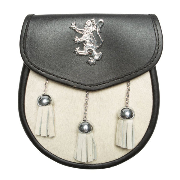 Semi dress sporran in cream calfskin with 3 matching chain cap tassels and central lion motif with button fastener and chrome finish finish.