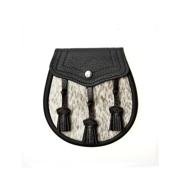 Scottish made semi dress sporran in natural calfskin and dark brown leather with three knotted leather tassels featuring a classic style embossing on the lid.