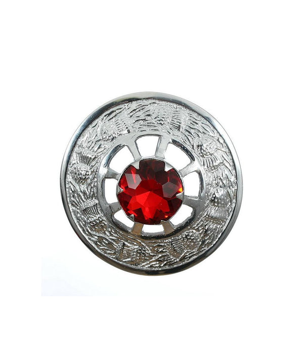 Thistle Design and Red Stone Brooch - Chrome Finish