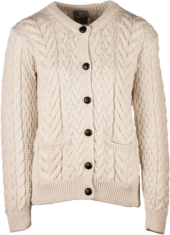 Beautiful women's crew neck cardigan made from 100% merino wool with traditional cable aran pattern.