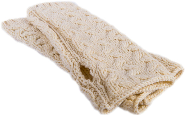 Beautiful women's long length one size fingerless mittens made from 100% merino wool with traditional cable aran pattern.